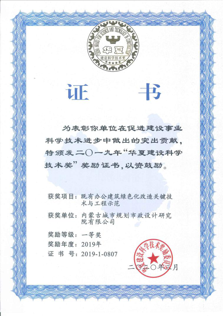 我院《既有辦公建筑綠色化改造關(guān)鍵技術(shù)與工程示范》項(xiàng)目榮獲2019年度華夏建設(shè)科學(xué)技術(shù)一等獎(jiǎng),近日受到表彰,是內(nèi)蒙古自治區(qū)唯一榮獲一等獎(jiǎng)項(xiàng)目和單位。